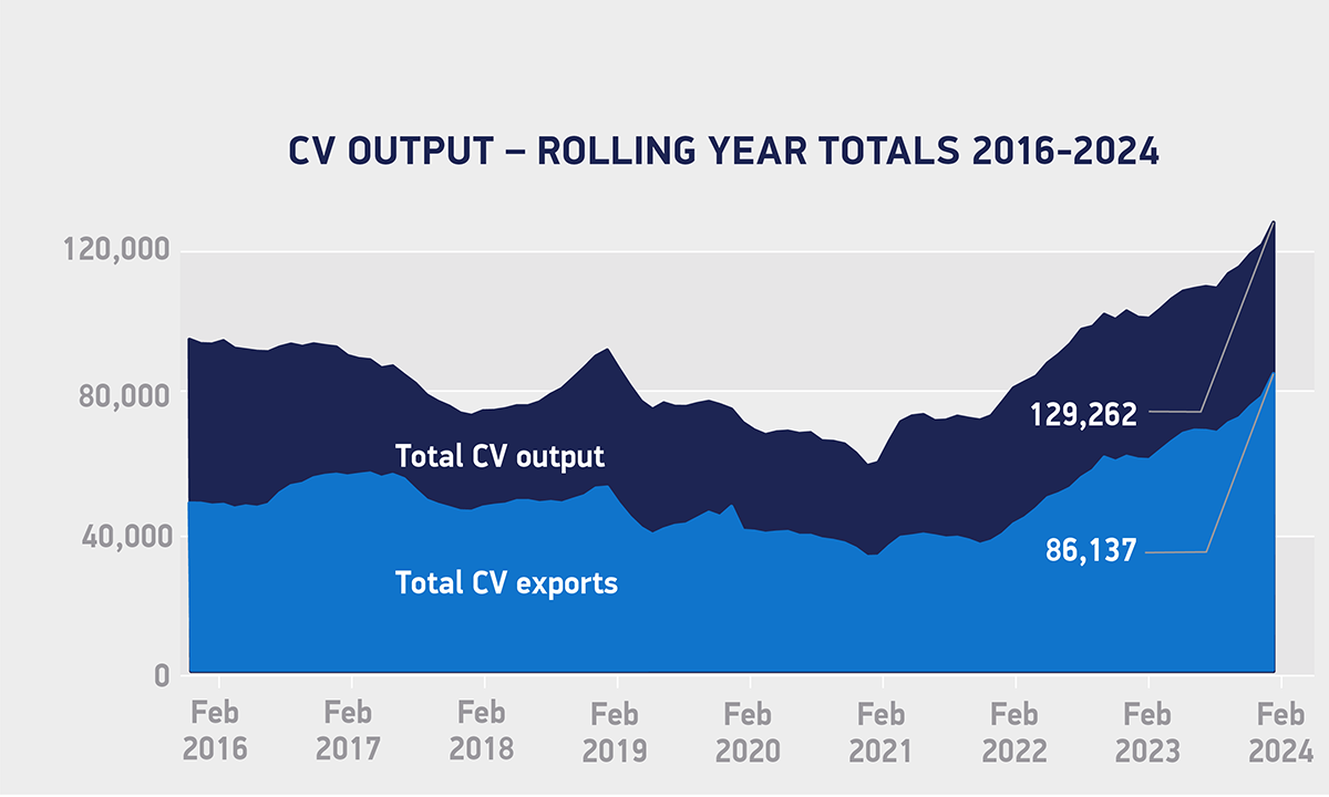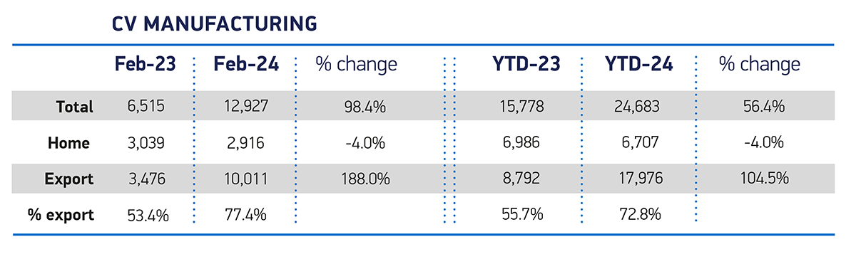 In the year to date, 24,683 CVs have been built in Britain, up some 56.4% on the first two months of 2023. Exports have driven this growth, up 104.5% to 17,976 units, an increase of 9,184, while volumes for the home market have fallen by 279 to 6,707.