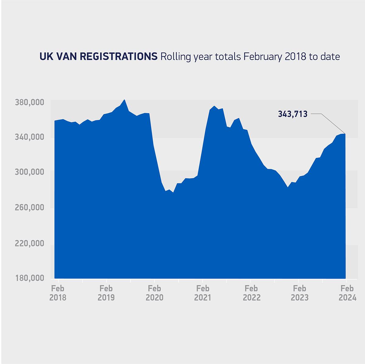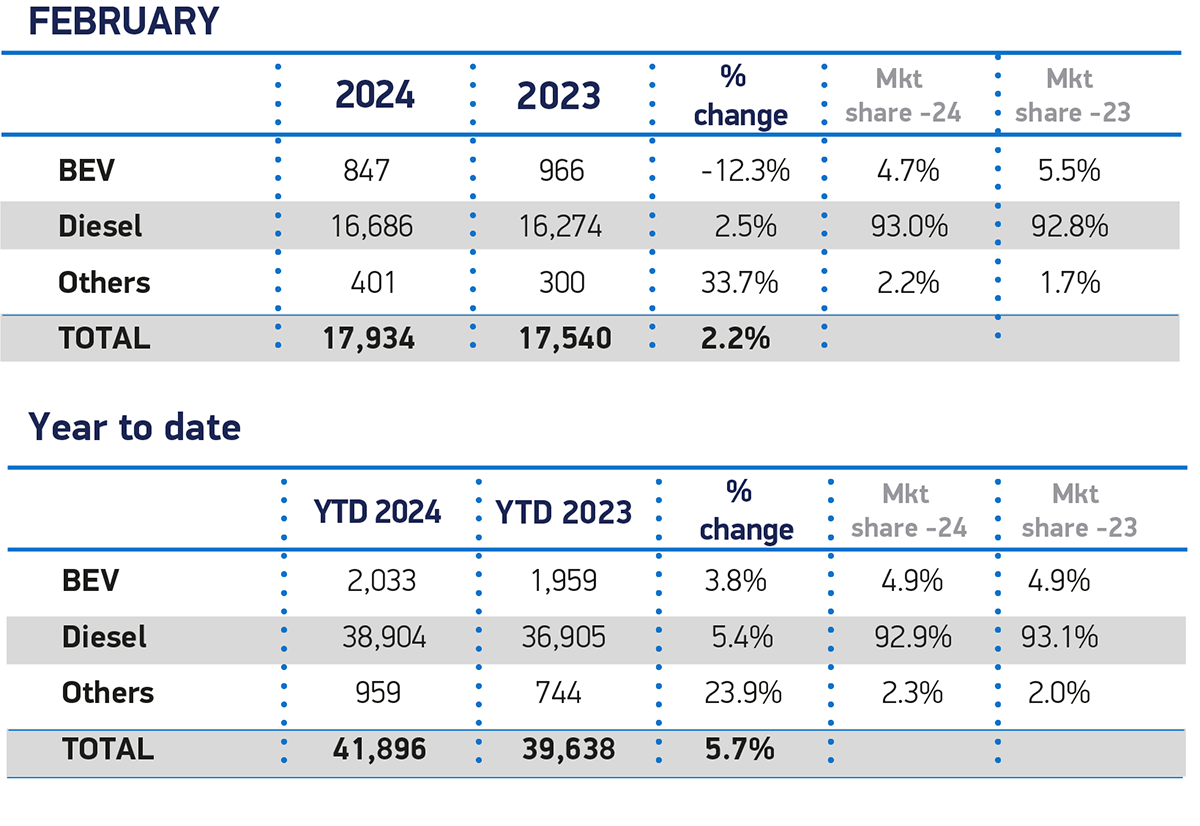 With each manufacturer now mandated to achieve a minimum proportion of zero emission registrations every year, February saw a decline in registrations of battery electric vans weighing up to 3.5 tonnes, falling by 119 units to 847 units, and taking a 4.7% market share, down from 5.5% a year ago. Maintaining existing purchase incentives and ensuring chargepoint rollout – including van-specific charging infrastructure – will be essential to help raise demand to the level needed to deliver net zero rapidly.