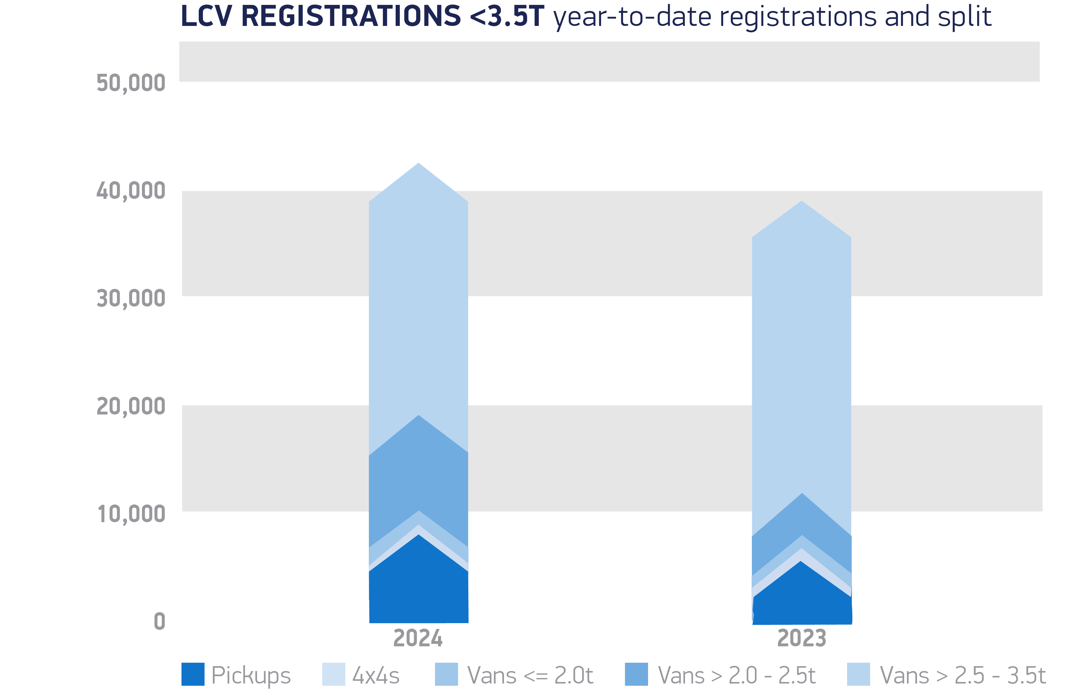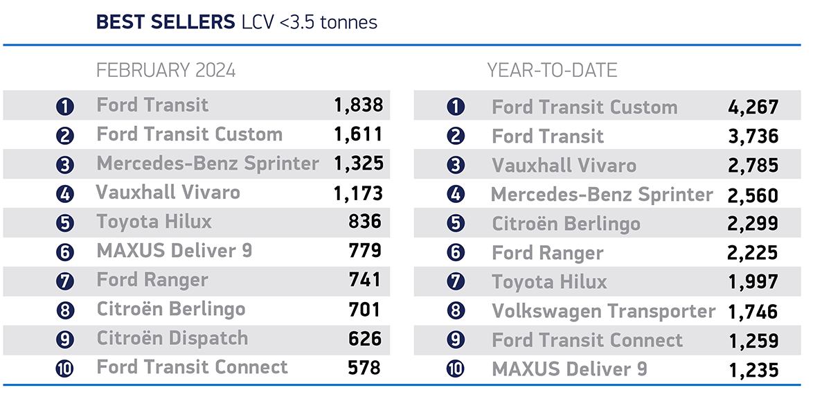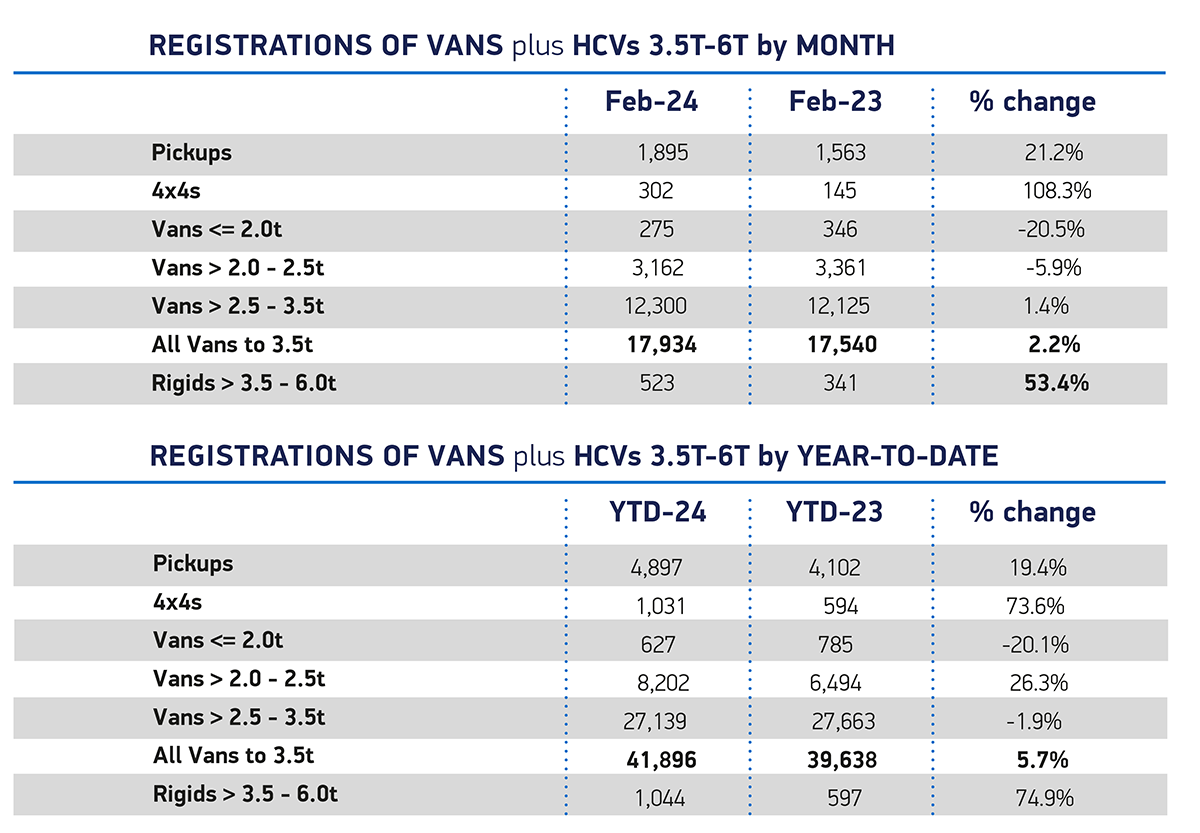 Registrations of vans weighing greater than 2.5 to 3.5 tonnes rose by 1.4% to 12,300 units, representing almost seven in 10 (68.6%) of all new vans as the trend for larger units continues. Deliveries of small vans weighing up to and including 2.0 tonnes, and medium-sized vans weighing greater than 2.0 to 2.5 tonnes, both saw declines, falling by -20.5% to 275 units and -5.9 % to 3,162 units respectively.