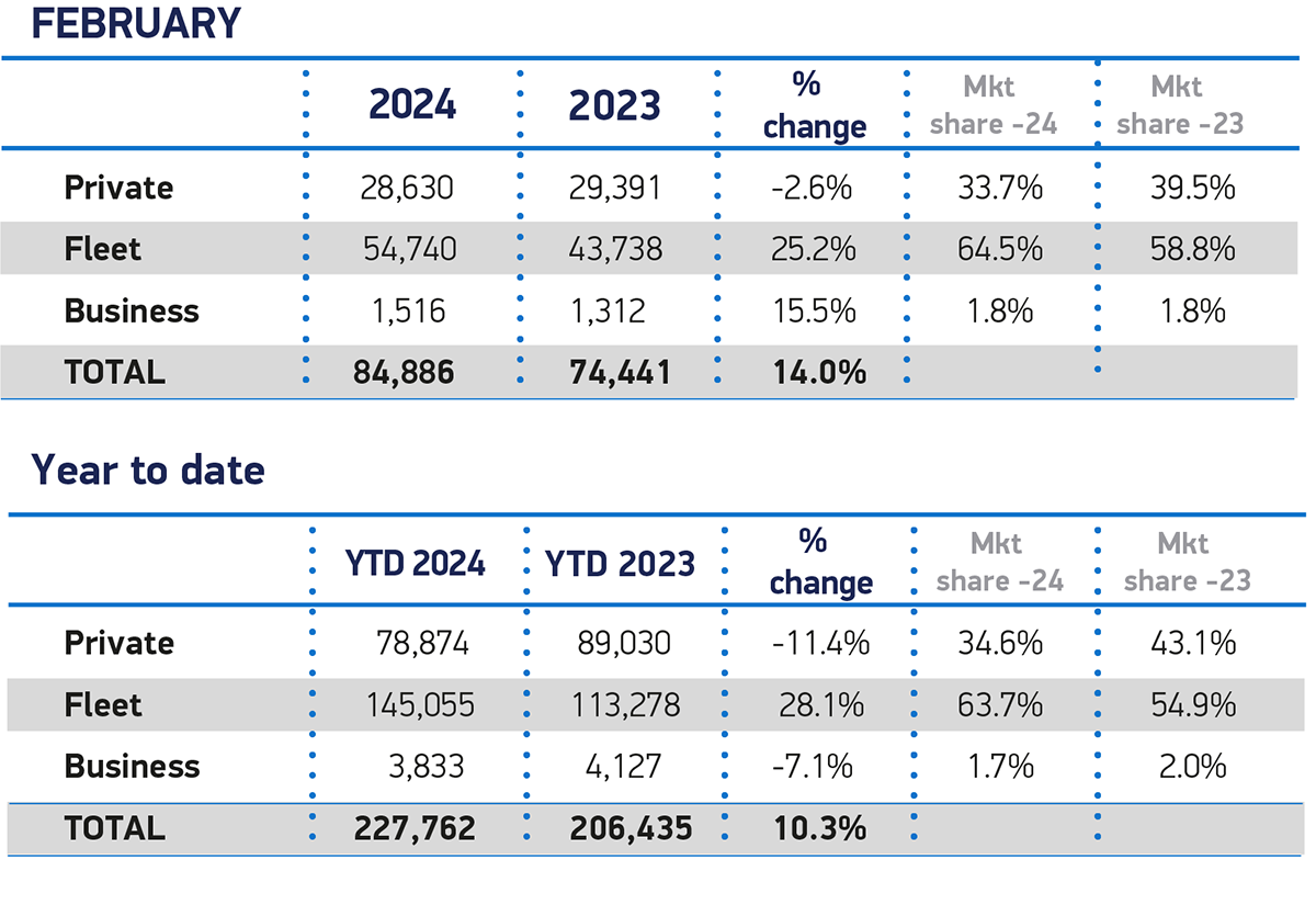 While February’s growth is positive and demonstrative of ongoing robust demand for the latest vehicles, the long-term picture will become clearer in March, the busiest market month. While BEV market share and volumes continue to grow during the first year of mandated targets for manufacturers, the increase in uptake is entirely sustained by fleets, thanks to compelling fiscal incentives. Private buyers account for fewer than one in five (18.2%) new BEVs registered in 2024 so far.