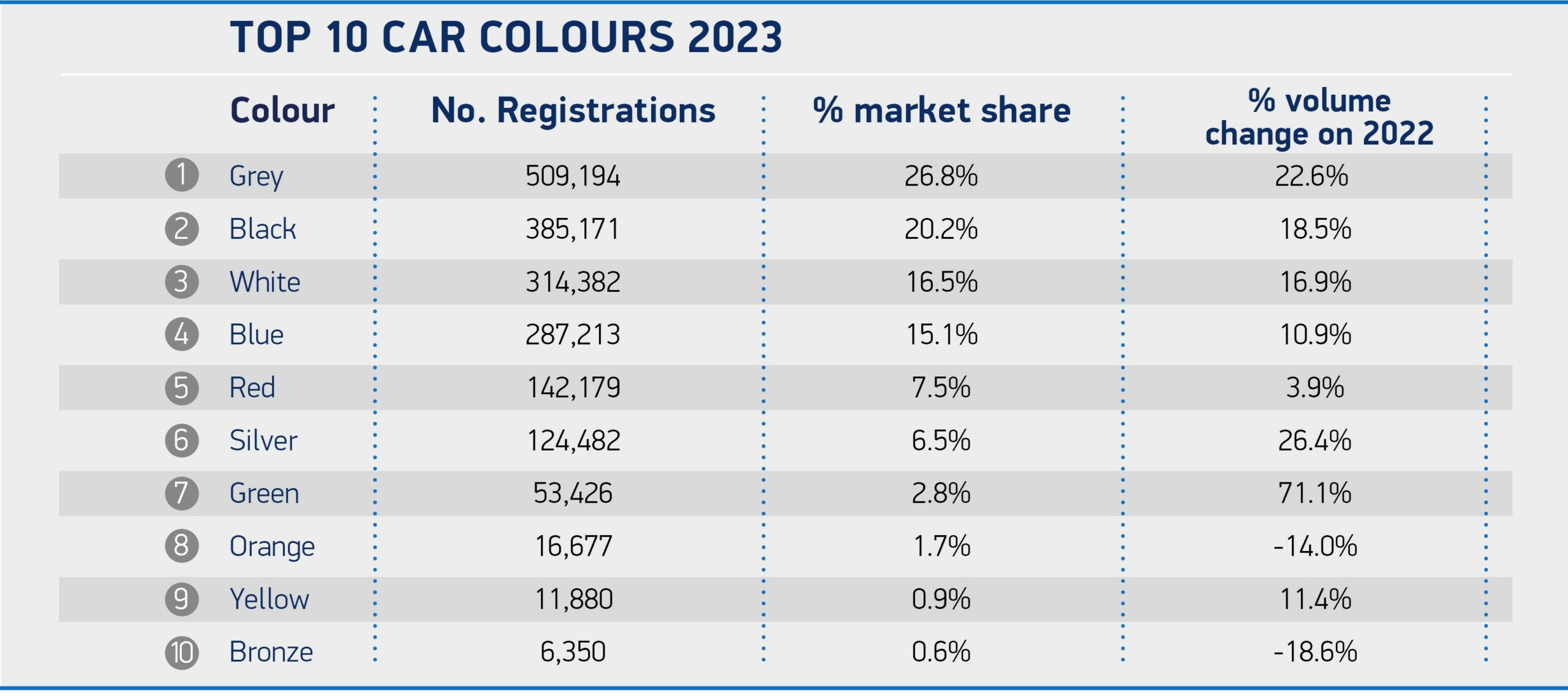 Completing the podium, black and white held second and third place, also for the sixth consecutive year, and recorded their best volumes since 2019. Almost two thirds (63.5%) of all new cars joining UK roads in 2023 were decked in monochrome, while blue rose 10.9% to take fourth place and red remained in fifth – although it also recorded its lowest market share since 2005 and has seen its popularity steadily decline since 2019.2