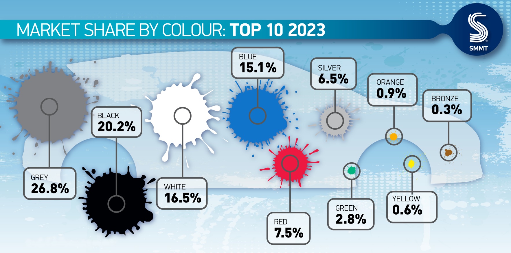 Britain’s drivers cemented their preference for monochrome cars as grey topped the new car colour chart for the sixth year in a row, according to the latest figures published today by the Society of Motor Manufacturers and Traders (SMMT). Boasting a market share of more than a quarter (26.8%), more than half a million (509,194) grey cars were registered in 2023, with volumes rising 22.6% as the new car market enjoyed its best year since the pandemic.1